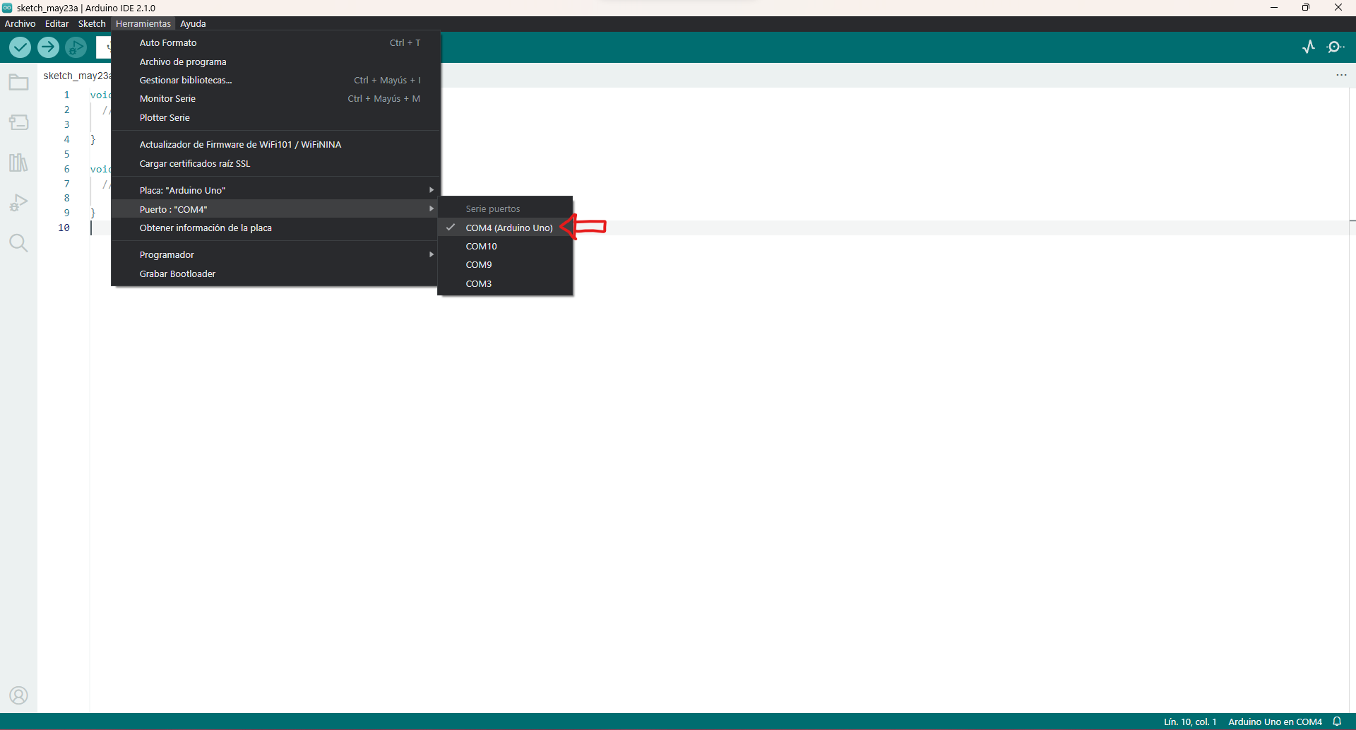 A continuación, selecciona el puerto serial al que está conectada tu placa Arduino. En Windows, puedes encontrar el puerto en el "Administrador de dispositivos". En Mac, aparecerá como "/dev/cu.usbmodemXXXX" o "/dev/tty.usbmodemXXXX" en la sección de puertos.