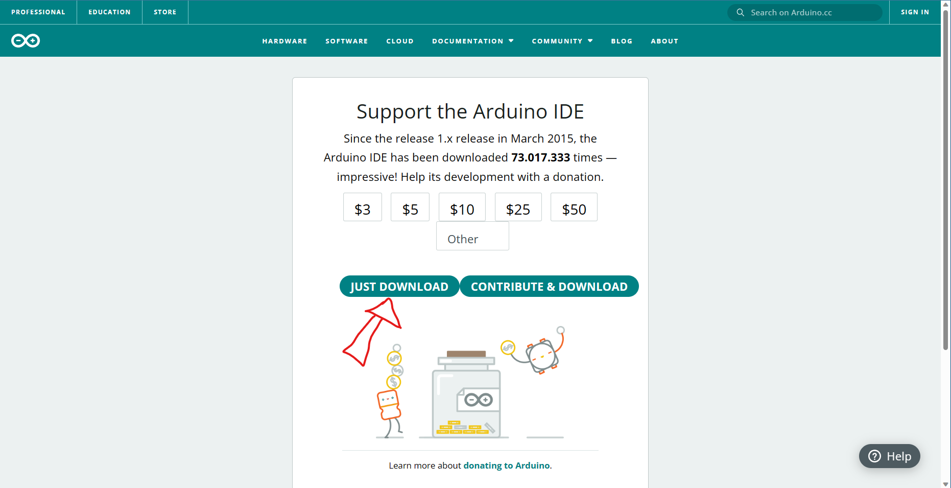En la siguiente pantalla, decide si quieres donar a la fundación Arduino o simplemente descargar de forma gratuita haciendo clic en "Just Download" para iniciar la descarga.