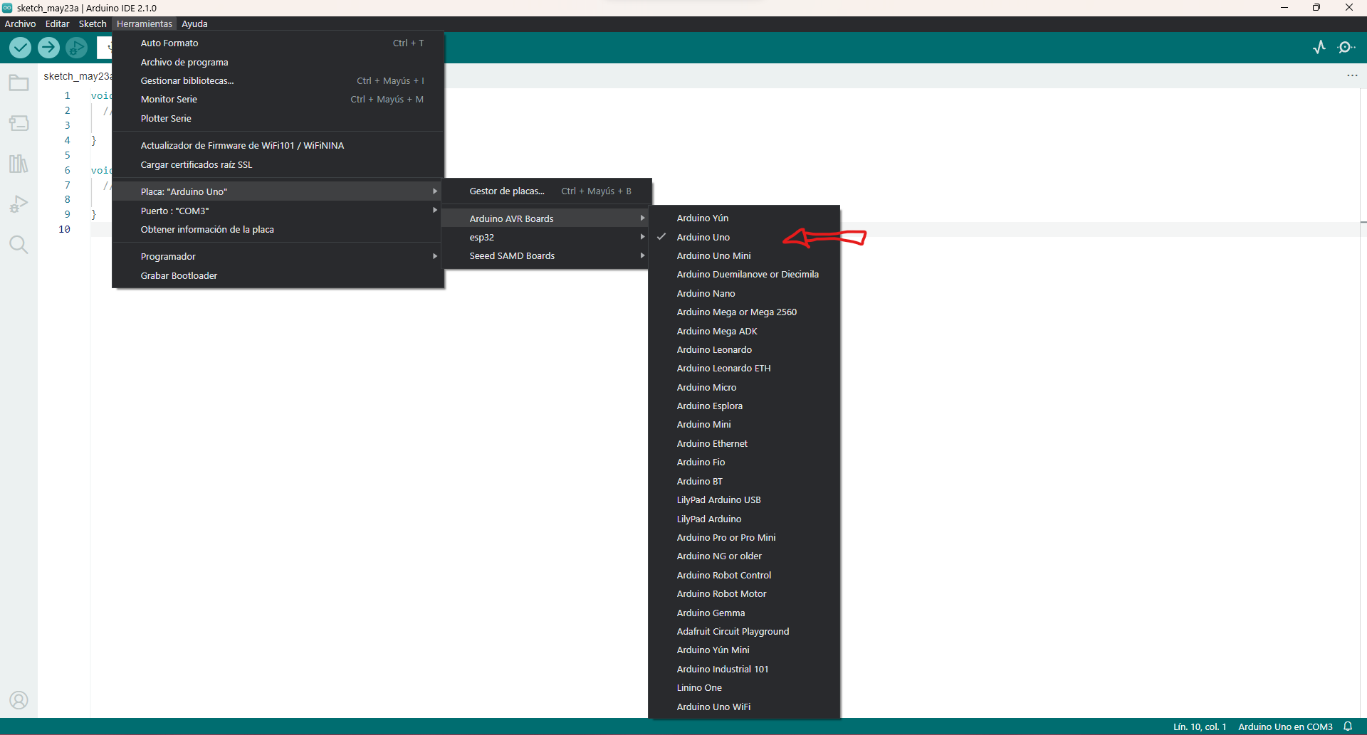 Ve al menú "Herramientas" y selecciona el modelo de placa Arduino que estás utilizando. Por ejemplo, si estás utilizando un Arduino UNO, selecciona "Arduino/Genuino UNO" en la lista desplegable. (En la imagen, verás que yo tengo más placas instaladas, por lo que a ti quizás solo te aparezca Arduino AVR Boards y no todas las opciones).